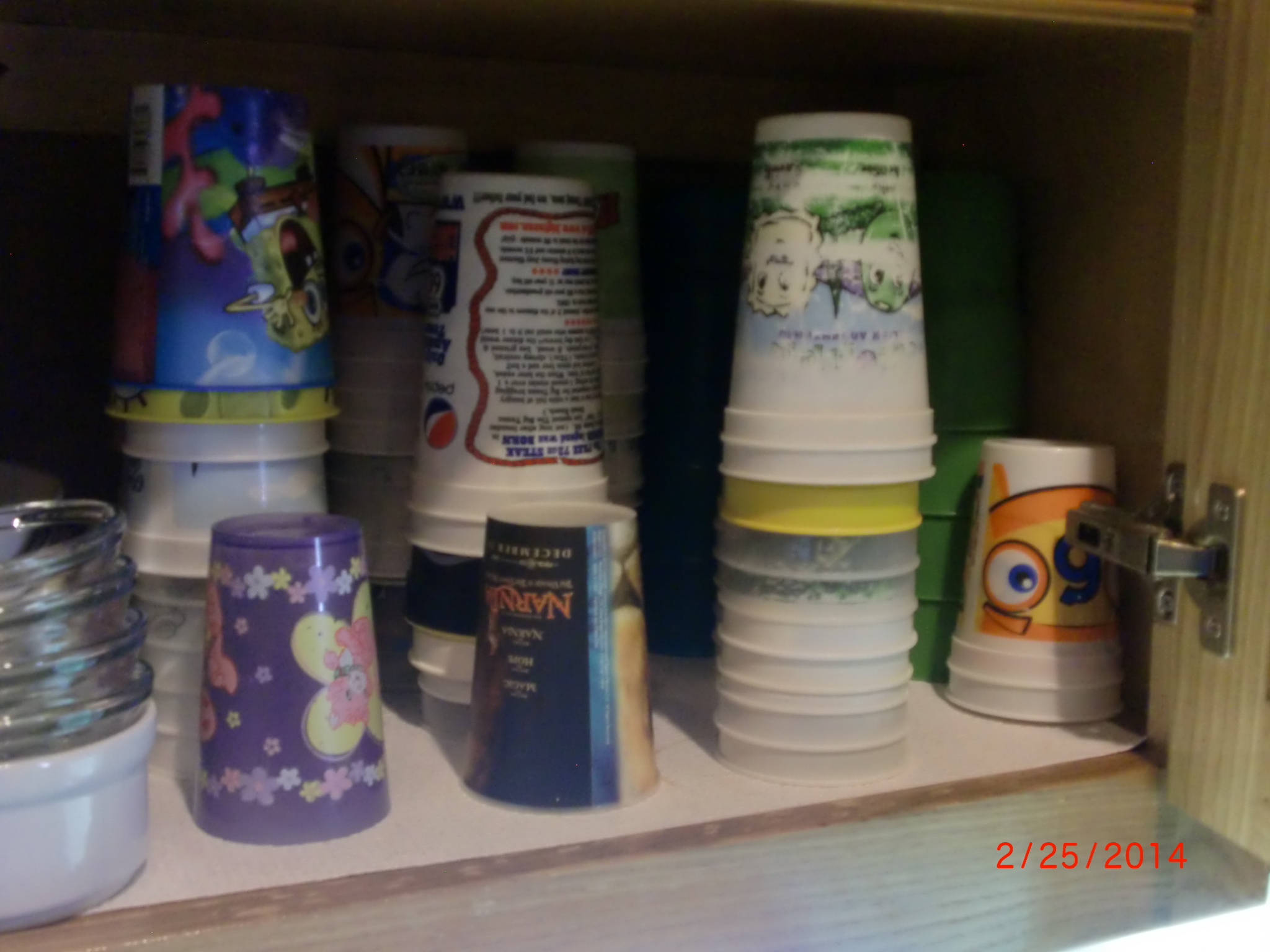- When the cups are put in the cabinet, they have to be stacked. If someone wants to put the cups away quickly, they just stack them randomly and deposited a mismatched set on the shelf. If someone were OCD, this might be a problem, Unfortunately, none of the kids are aware of the character flaw that is apparent when they choose to put unrelated cups together. I generally plan a stack “reshuffle” shortly after each dish washer load. The good thing about cups is they don’t “clink” together, and they stack. The more they stack the less shelf space needed.