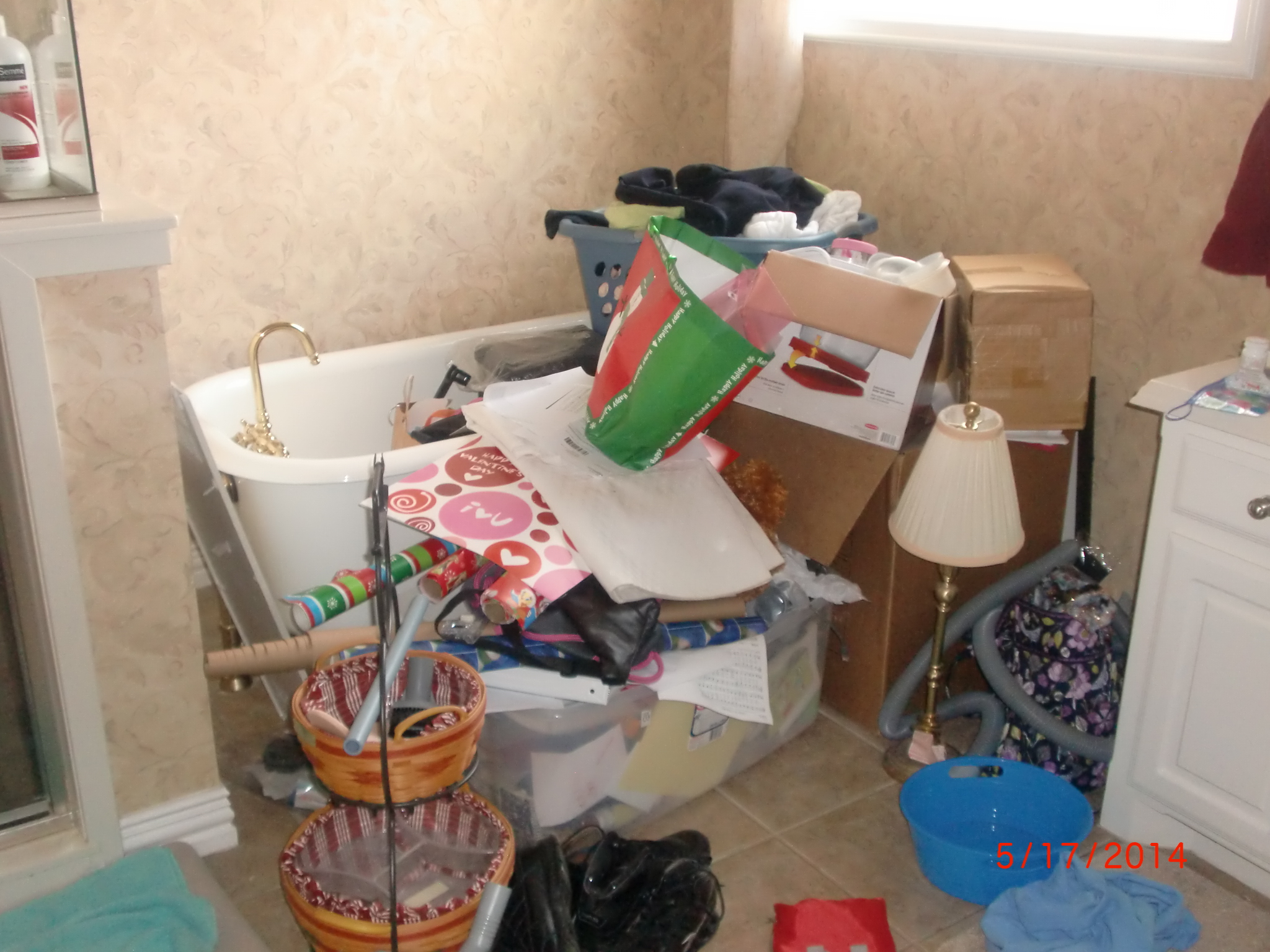 We didn’t wake up one day and determine this was a good day to be hoarders. We didn’t all of a sudden think, “passing up a real good deal is not worth it if I have a square foot of floor space available. I should spend all I have to fill that space.” And, we didn’t even say, “I need a hobby–I should hoard.” The consequences of the decision are something we don’t yet fully understand. As the picture above indicates, our bathtub is no longer usable. A corner of our bedroom is the proud parent of a growing stack of tubs and boxes. The end of our bed also has a stack allowing only a narrow passageway out from my side of the bed.