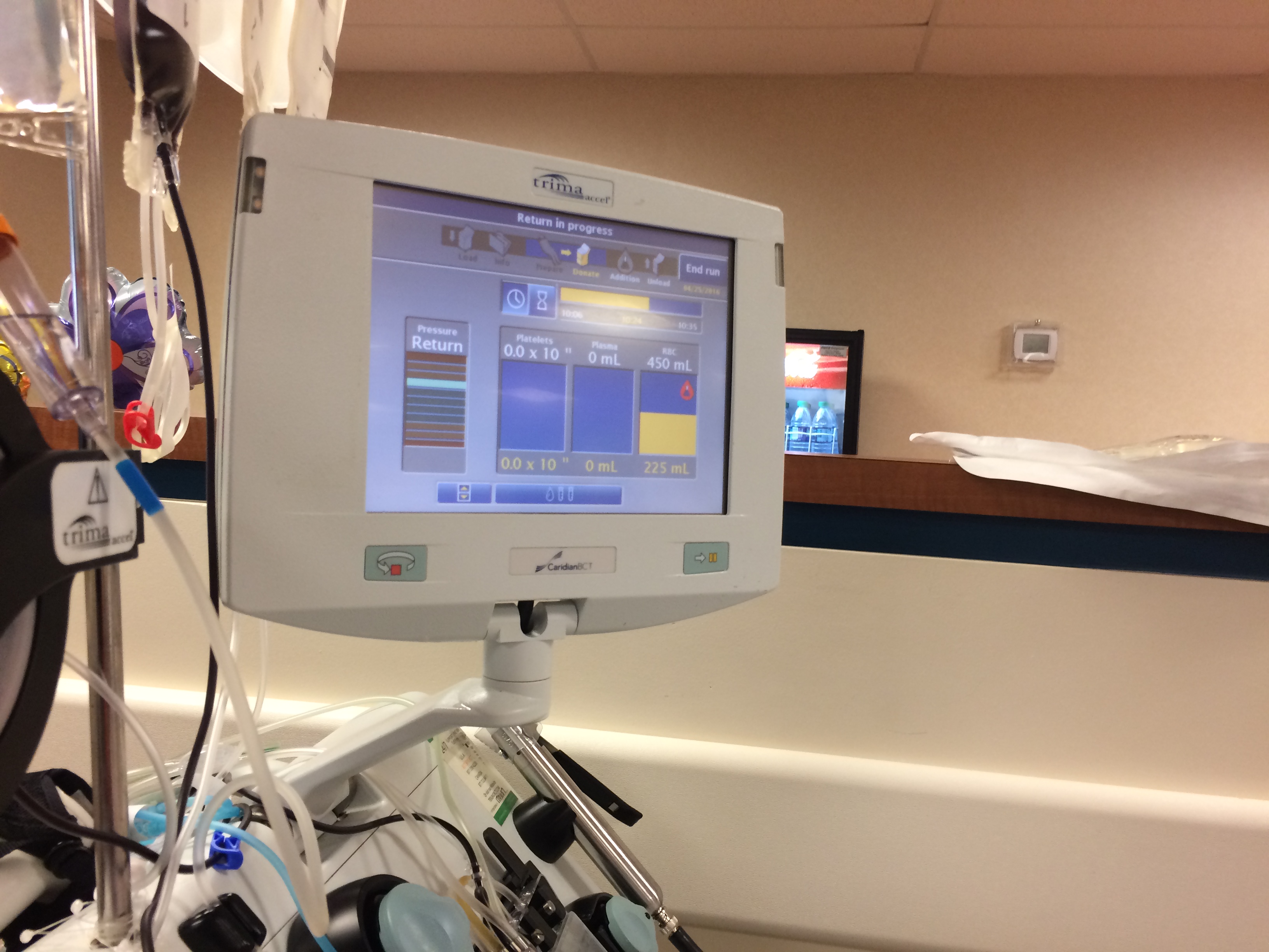 This is the room where you can lie (or tell the truth) before being told they won’t be able to take your blood today. The person helping me today was very nice. She did, however, admit to having a vein fetish since she starting working there. She claims she could not go into social settings or spend time with loved ones without trying to see if they had good veins for giving blood. (When giving blood, these veins are typically on the inner elbow.) My two cups of coffee made my blood pressure higher than I wanted. I was not disqualified yet. After she confirmed my blood was “thick” enough for a double red donation (instead of giving every 8 weeks, double red donors give every 16 weeks. They give “double” the amount of red blood cells given by whole blood donors. ) Since it has been over 4 months since I had given blood, the pre-screening questions had changed a little. They are now digging into Zika and whether you may have had contact. They are also tracking whether people have had an endoscopy within the past few months. (The screener had no good explanation why they are doing this. She said neither a “yes” or “no” answer here would throw an error code and prevent you from giving. Answering wrong to the HIV questions, would keep you from donating on that day….or ever.) It was also new for the screener to stay in the room while I answered the questions. Apparently, an “efficiency expert” (she literally told me they had been evaluated to make them run better.) had told them too much time was being wasted by potential donors waiting on staff. Today, things kept moving very nicely.