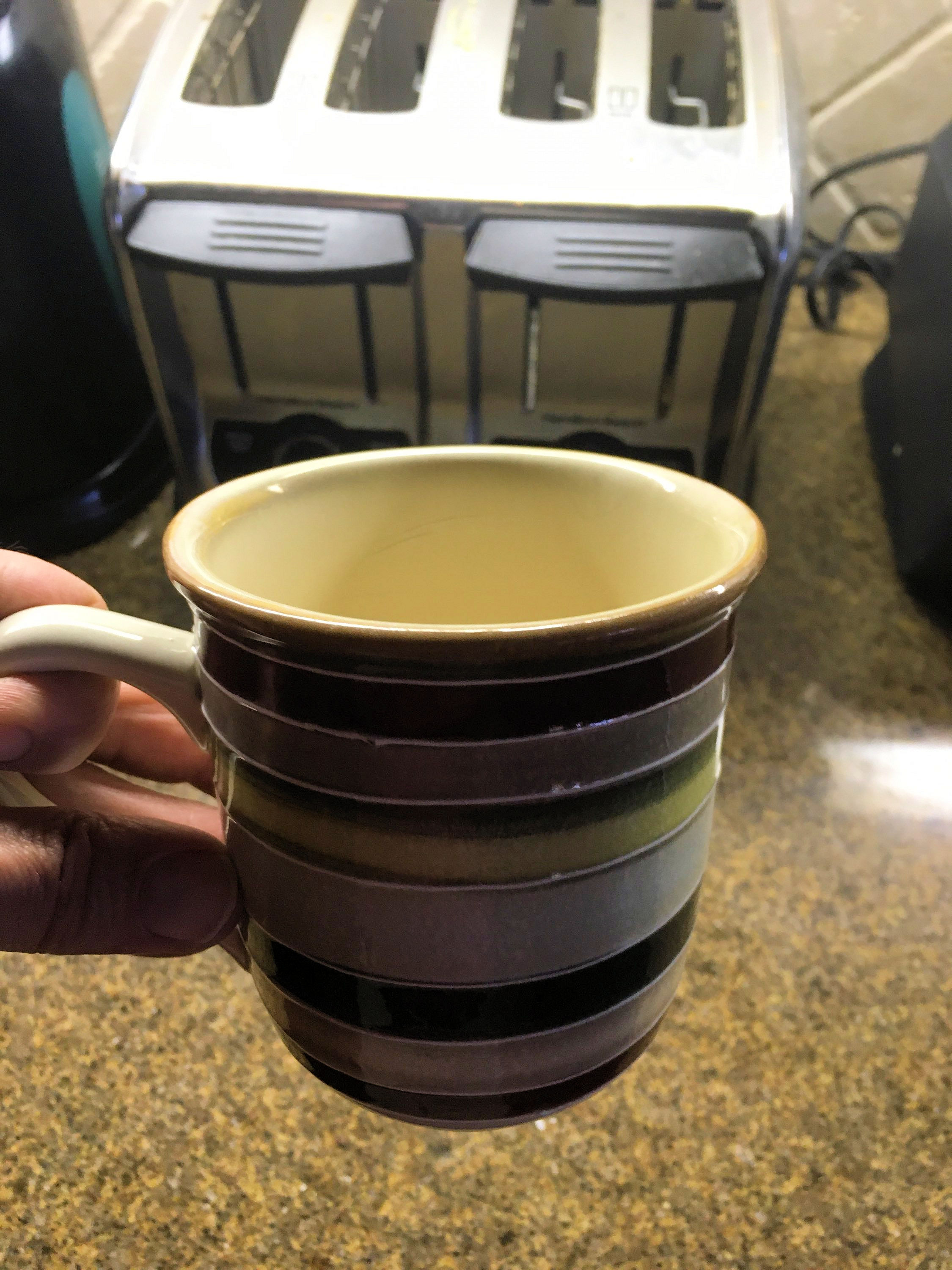 This mug said goodbye to one of its siblings today. When they started, they were a set of quadruplets. Romantically, I could say my wife got these mugs for me as we spent our first Christmas together. She hoped its impressive depths would make me addicted to coffee for the duration of my earthly existence. As of today, only one sibling remains. Today’s accident was my fault. To avoid doing dishes, I creatively stacked the dishes on the counter. When my wife came into the kitchen, she accidentally bumped my stack. I could say my deceased mug was a hero and sacrificed himself for others, but we all know that is not true. He became another statistic. I have no recollection of how the first sibling died. The previous sibling was bumped, and it no longer had a grip on its handle. Because I could not let go, I glued the handle back on the mug. It was a poor repair job. It saddened me every time I lustily drank coffee from its incredible reservoir of caffeine. After too many repairs and possibly a stern talk from one of my children, I let it go.