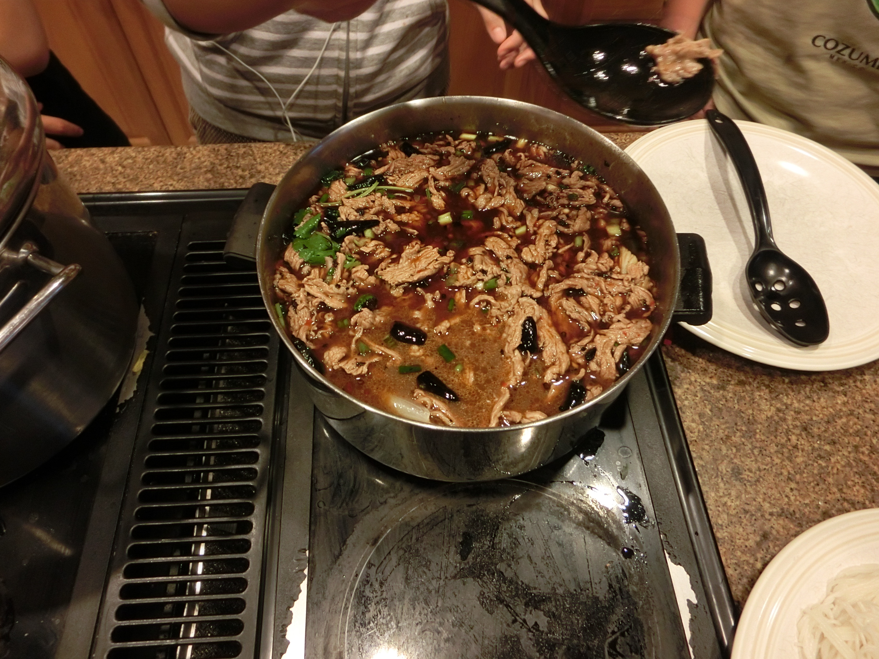 We cooked on the wok. Peanut oil was put in the bottom of the wok. The chopped ginger and hot peppers went into the oil. A couple large dollup of the red bean paste along with a good dollup of Chinese bottled red pepper paste were added. Once the flavor was drawn out of the ingredients, 6-8 cups of water were added. Soy sauce and a bit of the oyster sauce were also added. Once the water/oil mixture was heated, the meat pieces were all added. They were NOT dumped in. The meat pieces were added slowly with each piece being separated. If the broth was not the right flavor, salt and/or pepper could be added here. Also, soy sauce could be added here.