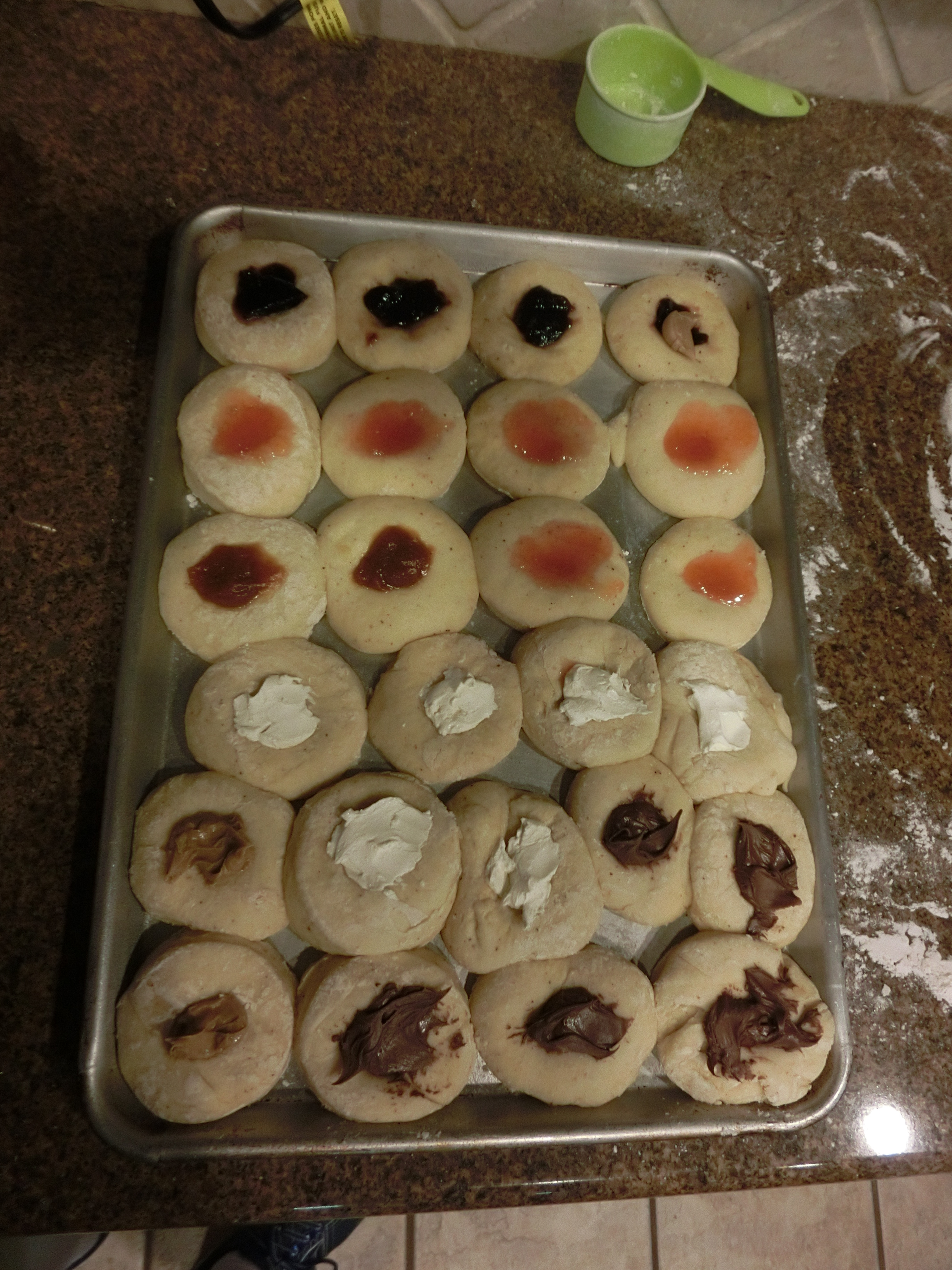 - Peanut butter seemed to work okay. When the peanut butter cooled, it had less affinity for the kolache than the jellies.